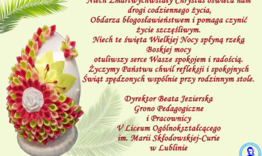 Wielkanoc to czas otuchy i nadziei. Czas odradzania się wiary w siłę Chrystusa i drugiego człowieka. W imieniu Społeczności Szkolnej V Liceum Ogólnokształcącego im. Marii Skłodowskiej-Curie życzymy Wam, aby Święta Wielkanocne przyniosły radość oraz wzajemną życzliwość. By stały się źródłem wzmacniania ducha. Niech przesłanie Wielkiej Nocy trwa w nas jak najdłużej i pozwala tą radością […]