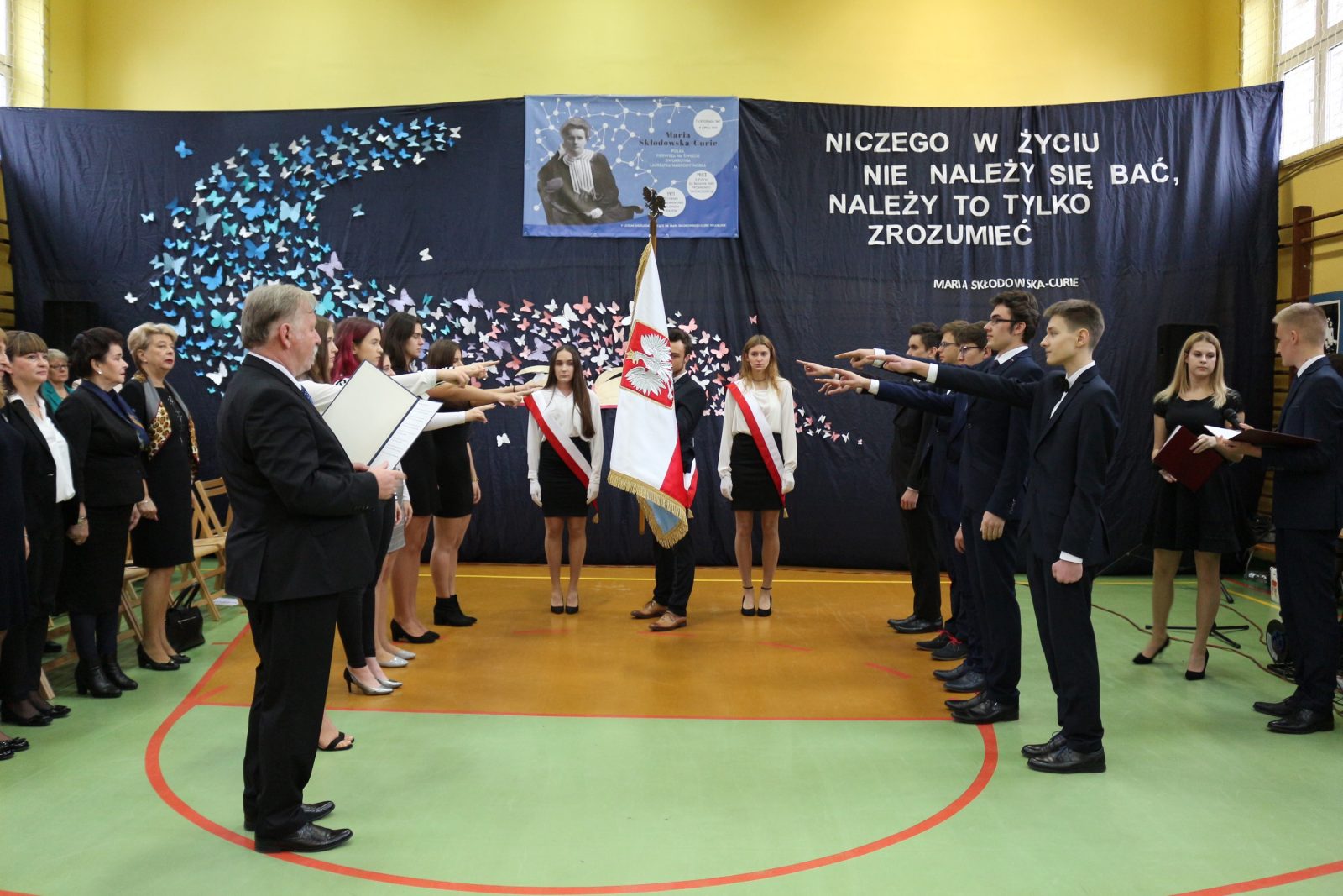 7 listopada w V liceum Ogólnokształcącym im. Marii Curie-Skłodowskiej odbyło się ślubowanie klas pierwszych. To bardzo ważne wydarzenie dla nowych uczniów szkoly. Uroczystość rozpoczęła się od części artystycznej przygotowanej przez uczennice: Kingę Skoczylas z klasy IIh, Marię Kopińską z klasy IIId i Weronikę Fedor z klasy IIIb. Zaproszeni goście, emerytowani nauczyciele, przedstawiciel Rady Rodziców, grono pedagogiczne i pozostali zebrani, wysłuchali przemowy Pana Dyrektora Zbigniewa Jakuszko, którego słowa wprowadziły uroczysty nastrój tego dnia. Prowadzącymi tego ważnego wydarzenia byli Przewodnicząca Szkoły – Weronika Muzyka oraz Wiceprzewodniczący – Wojciech Tylus z klasy IIh. Po ślubowaniu zgromadzeni udali się na słodki poczęstunek przygotowany przez pierwszoklasistów.