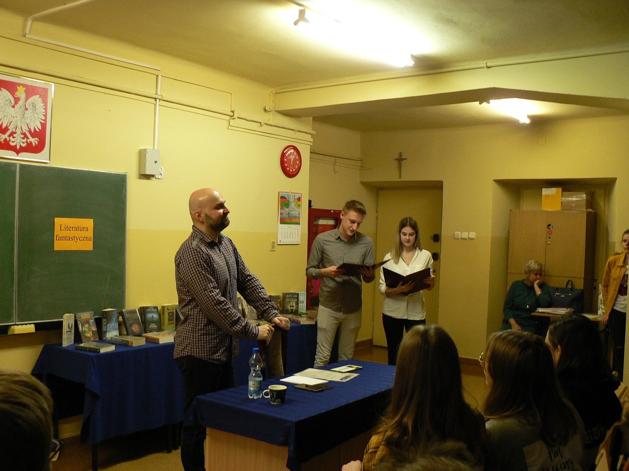 Pan Ziemowit Karłowicz z pasją opowiadał o literaturze fantastycznej. Przekazał informacje o zasady budowania światów fantastycznych. Mówił o sposobach konstruowania postaci głównych bohaterów. Przywołani zostali pisarze wyznaczający trendy w literaturze fantasy. Pan Karłowicz zachęcał uczniów do tego, by sami zaczęli pisać własne teksty.