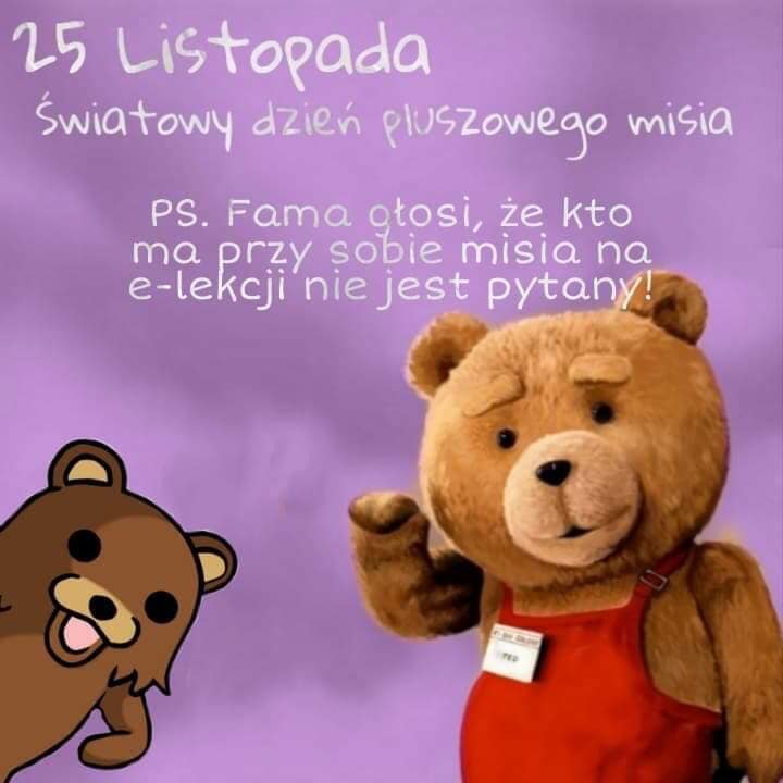 Na całym świecie 25 listopada obchodzi się dzień pluszowego misia, a z każdym rokiem przybywa atrakcji z nim związanych. Przez nauczanie zdalne nie jesteśmy w stanie przeprowadzić dnia tematycznego tak jak w latach poprzednich, ale znaleźliśmy na to rozwiązanie. Wszystkich chętnych zachęcamy do zrobienia sobie kreatywnych zdjęć wraz z pluszowym misiem i przesłanie ich do przewodniczących klas, tych z kolei o zebranie ich i wysłanie do Michała Omiotka, do godziny 23:59 25 listopada 2020r.. Za udział w wydarzeniu klasy otrzymają punkty do konkursu na „Superklase”.