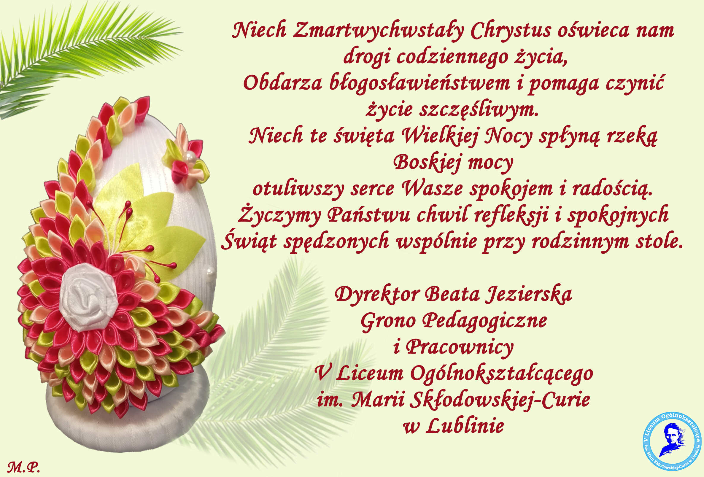 Wielkanoc to czas otuchy i nadziei. Czas odradzania się wiary w siłę Chrystusa i drugiego człowieka. W imieniu Społeczności Szkolnej V Liceum Ogólnokształcącego im. Marii Skłodowskiej-Curie życzymy Wam, aby Święta Wielkanocne przyniosły radość oraz wzajemną życzliwość. By stały się źródłem wzmacniania ducha. Niech przesłanie Wielkiej Nocy trwa w nas jak najdłużej i pozwala tą radością cieszyć się z innymi.
