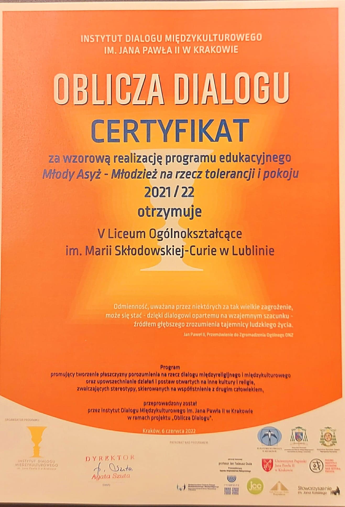 W dniach 8-9 czerwca 2022 r. uczestniczyliśmy w wycieczce do Krakowa i okolic. Wyjazd odbył się w ramach nagrody za zdobyty przez nas tytuł lidera w projekcie edukacyjno-wychowawczym „Oblicza Dialogu”. Nagrodą zdobytą przez uczniów dla Szkoły jest teleskop soczewkowy do oglądania gwiazd, Księżyca i najjaśniejszych planet. Konkurs pt. „Pan wszelkiego stworzenia. Obraz natury w religiach i kulturach świata” trwał od listopada 2021 do maja 2022 roku. Każdy z uczestników tego projektu mógł nie tylko pokazać swoje umiejętności informatyczne, dziennikarskie, ale również dowiedzieć się wielu nowych rzeczy o przyrodzie i jej rozumieniu w religiach i kulturach świata. Strona internetowa lovlu.obliczadialogu.pl, którą tworzyliśmy poszerzyła naszą wiedzę z zakresu naszej chrześcijańskiej religii i kultury, ale również z obszaru wierzeń i obrzędów żydowskich czy nawet indyjskich i afrykańskich z Tanzanii czy Kamerunu.