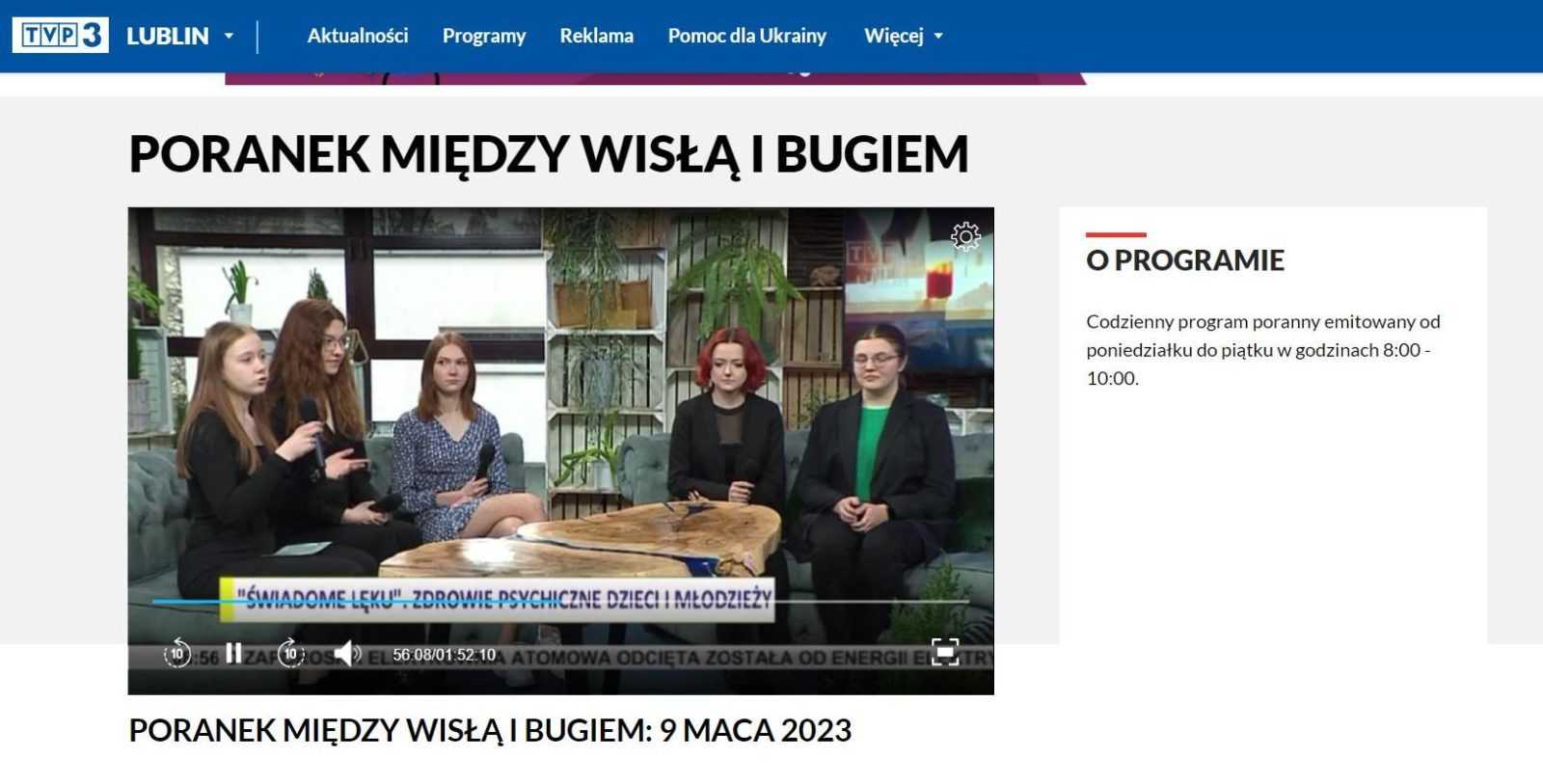 9 marca nasz projekt “Świadome lęku” miał okazję wystąpić w programie “Poranek między Wisłą a Bugiem”. Udzieliłyśmy tam krótkiego wywiadu na temat przebiegu naszego projektu. Atmosfera zarówno przed jak i w czasie nagrywania była niesamowita, i na pewno zapamiętamy ją na długi czas.