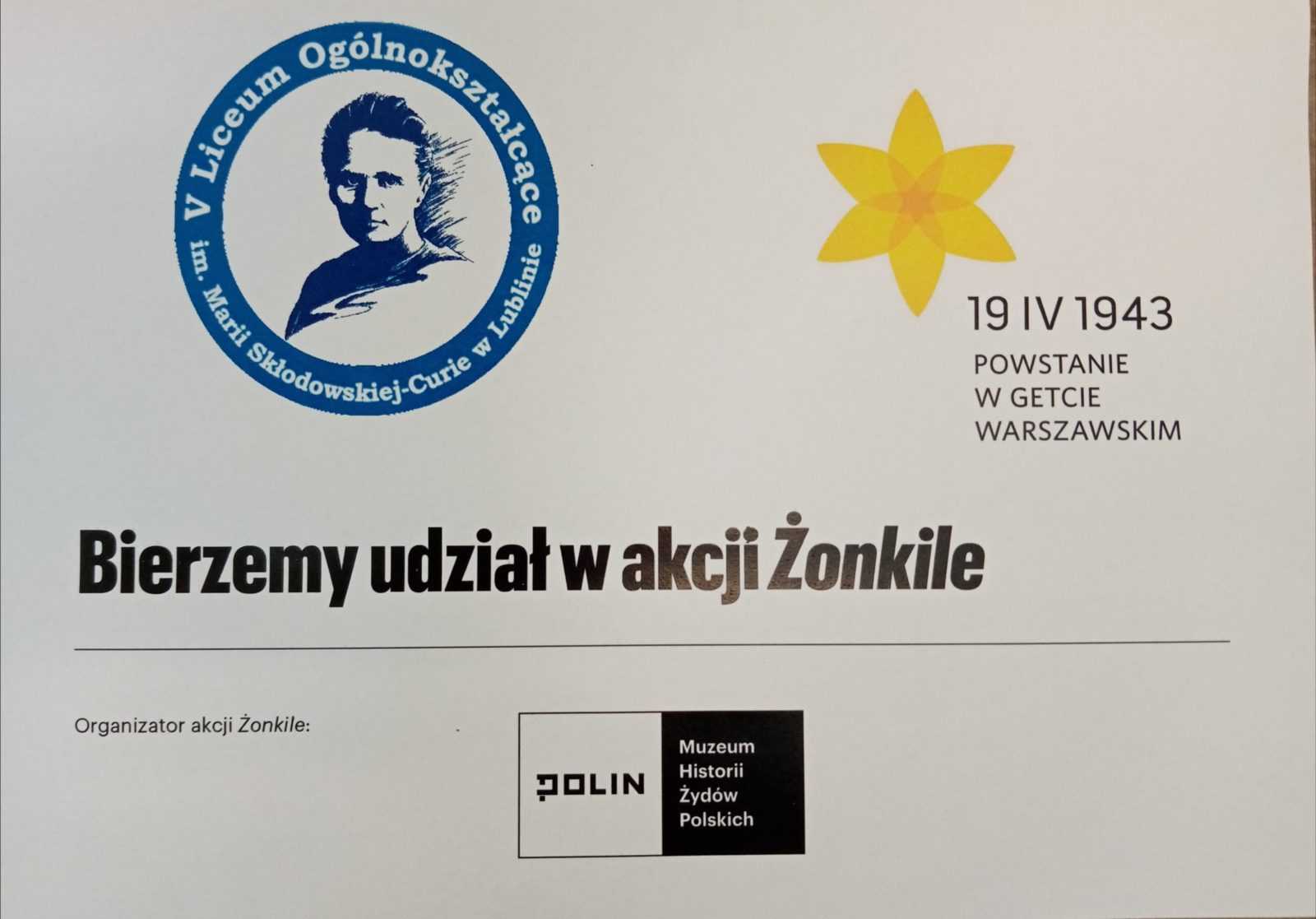 19 kwietnia 2023 r. nasza szkoła wzięła udział w akcji społeczno-edukacyjnej Żonkile upamiętniającej 80. rocznicę wybuchu powstania w getcie warszawskim.