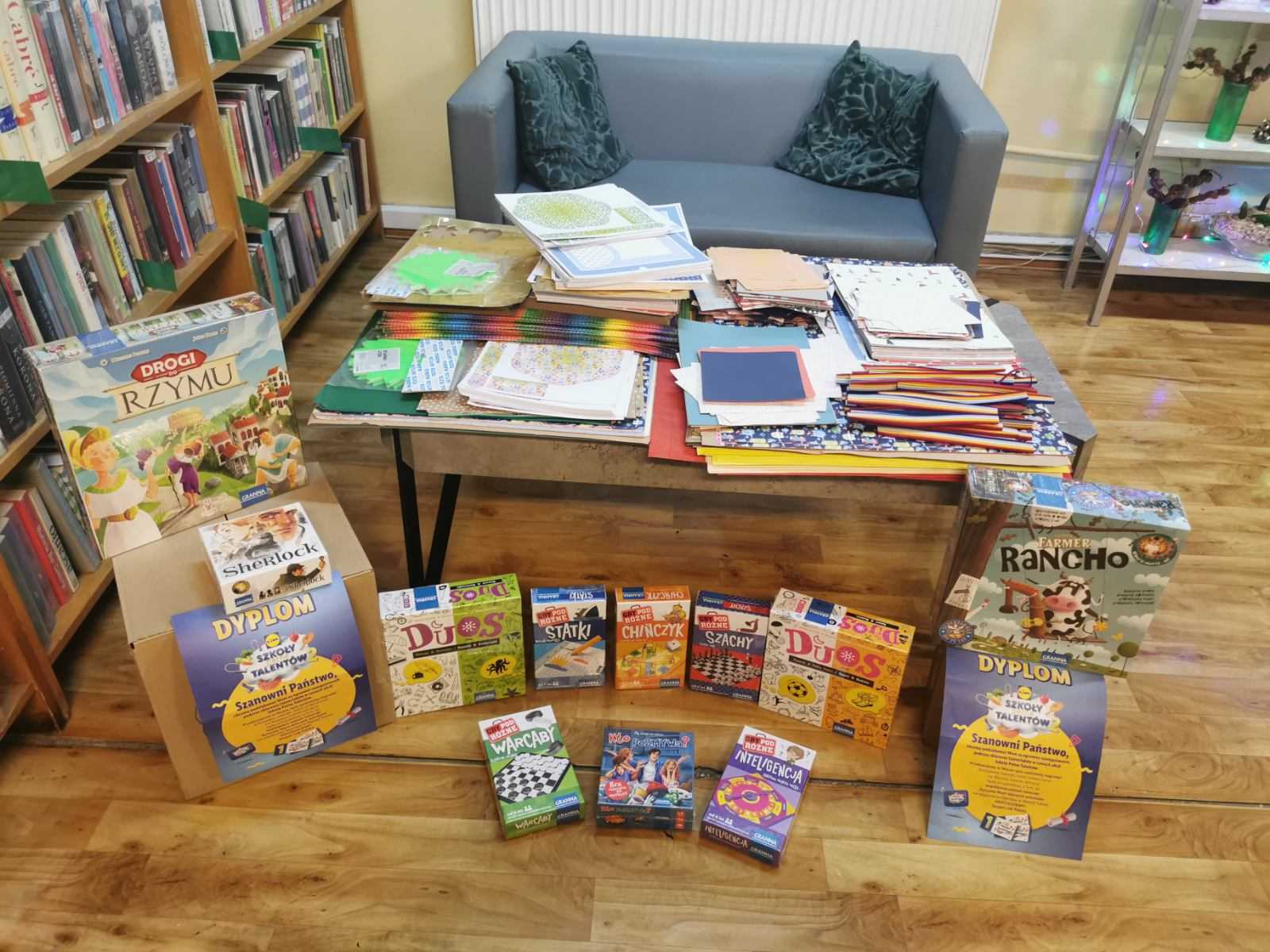 Wspólnymi siłami udało się nam nazbierać 2200 talenciaków otrzymywanych za zakupy w Lidlu. Zostały one wymienione na następujące nagrody: 2 zestawy gier planszowych (11 sztuk) i pudełko kreatywnych niespodzianek. Z gier można korzystać w bibliotece szkolnej.