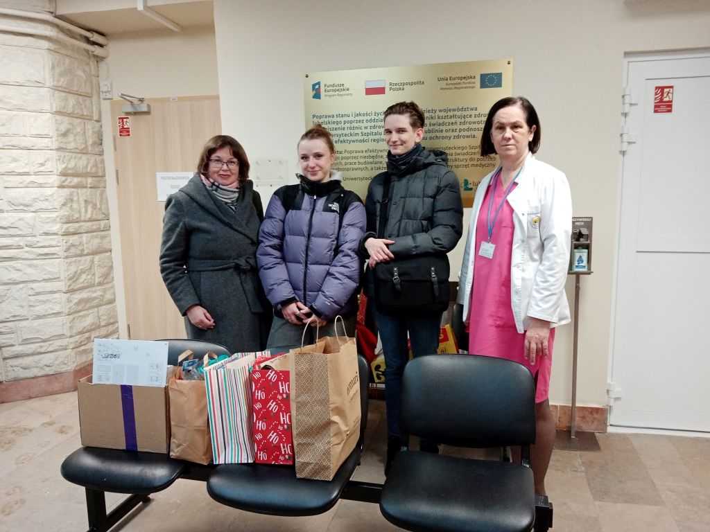 W dn. 05.12.20232r. nauczycielki bibliotekarki p. Emilia Kasprzak i p. Marta Wysocka oraz przedstawiciele Samorządu Uczniowskiego Gabrysia Kruk kl. 3g i Mikołaj Szymański kl. 3c udali się do Uniwersyteckiego Szpitala Dziecięcego w Lublinie, by przekazać materiały plastyczne zbierane w bibliotece szkolnej w dn. 17.11-4.12.2023 r. Materiały te zostaną wykorzystane przez dzieci przebywające na Oddziale Hematologii, Onkologiii Transplantologii Dziecięcej