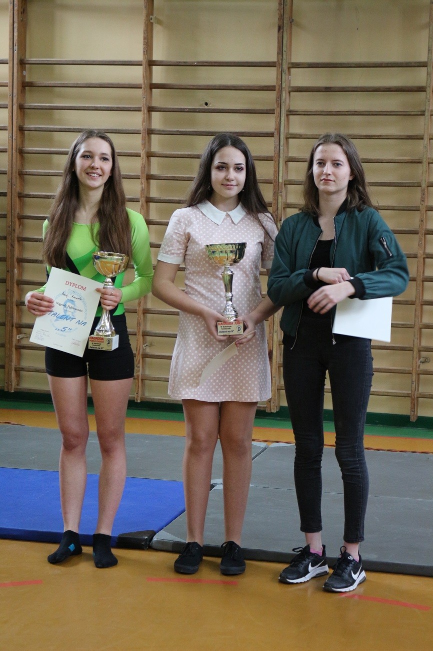 14.03.2018 w naszej szkole odbyła się dziewiąta edycja „Talentu na 5”. Nasi uczniowie po raz kolejny zaimponowali nam swoimi niezwykłymi umiejętnościami. Jesteśmy pod ogromnym wrażeniem wszystkich występów, więc wybranie zwycięzcy było nie lada wyzwaniem. Po zapewne niezwykle trudnych naradach, jury przyznało swoją nagrodę Julce Juć w duecie z Marysią Kopińską z klasy 1D. Jednak naszej społeczności szkolnej najbardziej przypadł do gustu gimnastyczny występ Ani Kawiak z klasy 1B. Wszystkim uczestnikom serdecznie gratulujemy!! c: